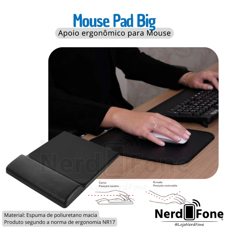 'metaTitulo' => 'ALMOFADA ERGONOMICA PARA PUNHOS; MOUSE PAD BIG PRETO - NERD FONE',