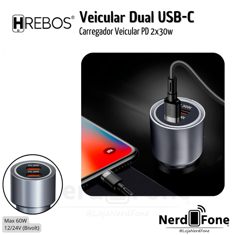'metaTitulo' => 'CARREGADOR VEICULAR 2x USB-C MAX 60W HREBOS - NERD FONE',