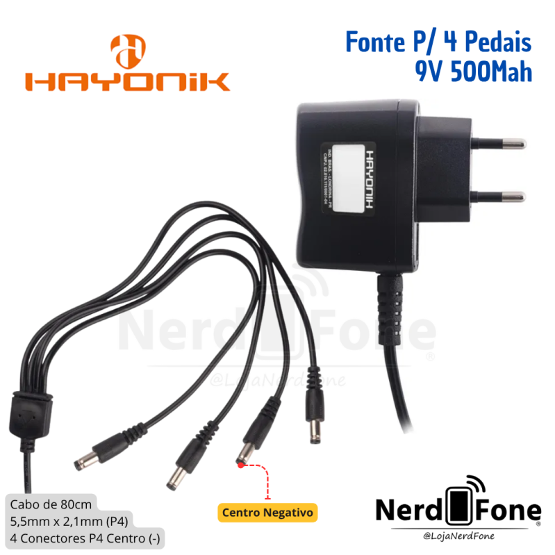 'metaTitulo' => 'FONTE CHAVEADA P/ 4 PEDAIS 9V 1A HAYONIK; 5.5x2.1MM CENTRO NEGATIVO P4 - NERD FONE',
