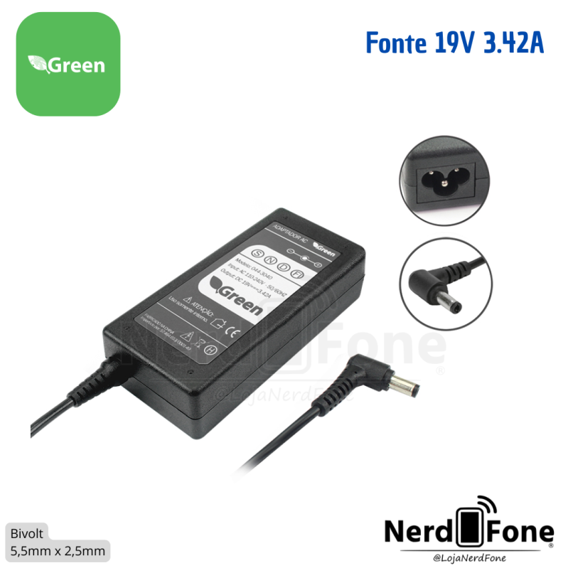 'metaTitulo' => 'FONTE CARREGADOR NOTEBOOK 19V 3.42A 5.5x2.5MM (PINO FEMEA) GREEN - NERD FONE',
