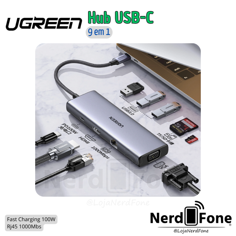 'metaTitulo' => 'HUB USB-C 9 EM 1 UGREEN; (VGA/HDMI/3XUSB-A/RJ45/SD/TF+PD100W) - NERD FONE',