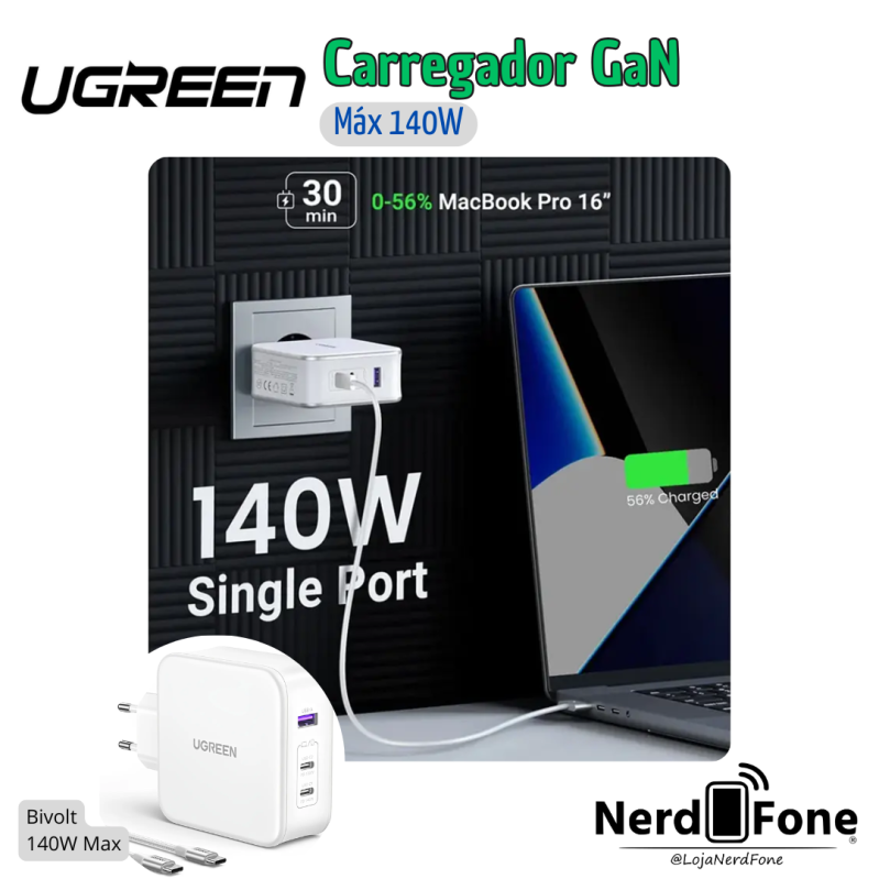 1. Tecnologia Avançada GaN: Este Carregador Ugreen oferece a mais recente tecnologia GaN, fornecendo carregamento rápido e eficiente. Com potência de 140W, é ideal para dispositivos que demandam alta energia. Seu design inteligente distribui a potência de maneira otimizada entre os dispositivos conectados, garantindo um carregamento seguro e rápido.
