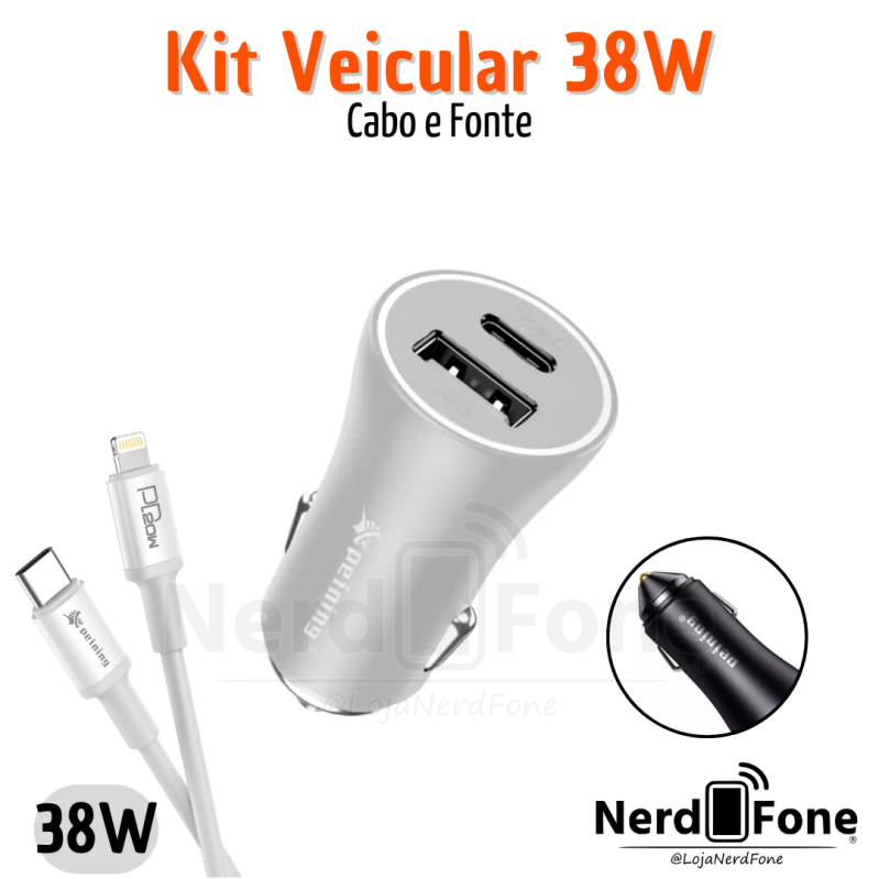 'metaTitulo' => 'KIT VEICULAR DUAL MAX 38W PEINING; CABO 1M USB-C x LIGHTNING - NERD FONE',
