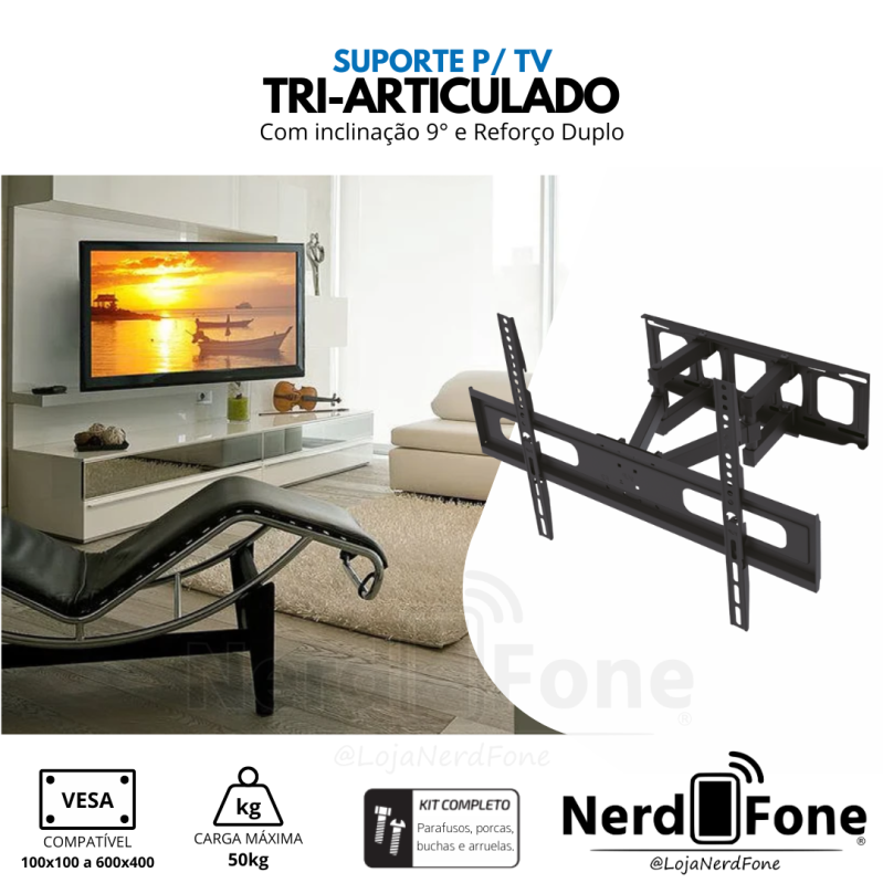 Suporte de TV Tri-articulado reforçado e duplo, é projetado para acomodar TVs de 32 a 85 polegadas, oferecendo flexibilidade máxima de visualização. Com seu design tri-articulado, permite ajustes precisos de inclinação, rotação e extensão, garantindo o posicionamento ideal da TV em qualquer ambiente. Sua estrutura sólida e acabamento preto elegante garantem durabilidade e estilo. Transforme a experiência de visualização com o Suporte de TV Tri-articulado